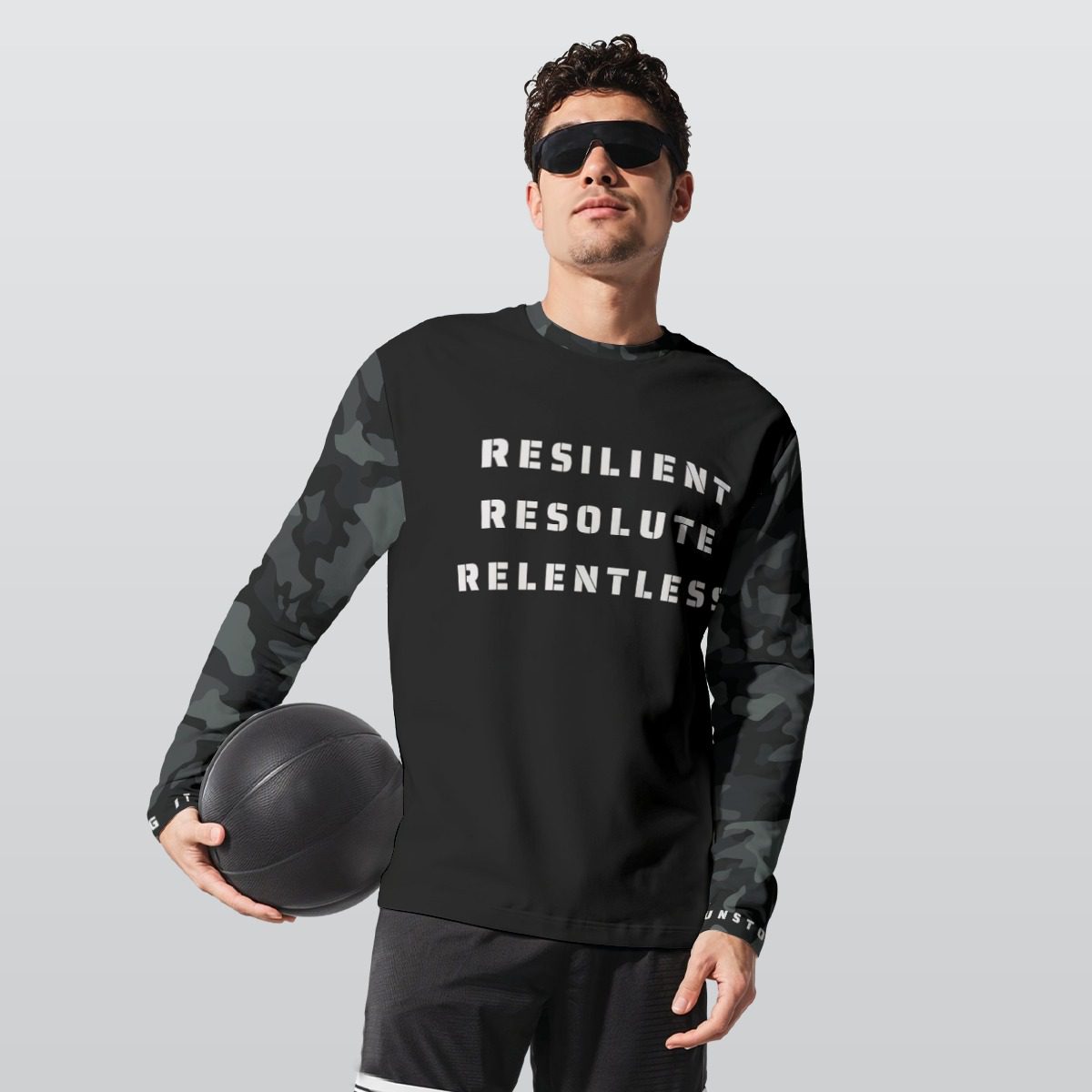 This classic T-shirt is gender neutral, has a regular fit, and is 100% cotten. The body of the shirt is black and the sleeves are a grey-black camo design. It can be worn for any casual occasion or dressed in a vest or blazer.